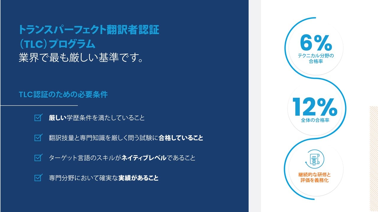 専門の言語スペシャリストについては、従来、さまざまな職業団体による資格証明が行われてきました。しかし、専門分野に関する知識や全般的な能力など、言語スペシャリストとして決定的に重要な要素を考慮した資格はありませんでした。こうした理由から、弊社はトランスパーフェクト翻訳者認証(TransPerfect Linguist Certification、TLC)プログラムを導入しました。TLCプログラムは、お客様にとって重要度の高い専門分野における言語スペシャリストのスキルを評価する、世界初の総合システムです。